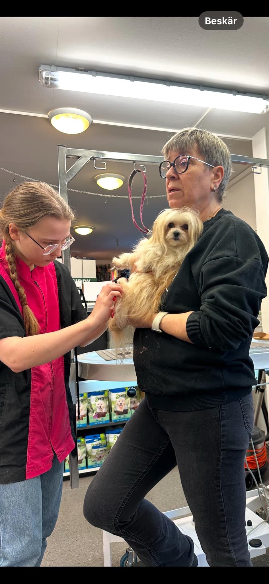 Bli fasthållen eller att hålla i hunden är stor skillnad – Vänj hunden vid att du tar tag i halsbandet och inte hålla fast hunden runt kroppen (som att bli fast i en sovsäck, då vill man komma loss), lyft upp ett ben i taget medans den andra håller i halsband Det finns olika sätt man kan välja om det fungerar mellan dig och hunden, som stående, sittande eller liggande. Men de flesta tycker att stå är det enklaste och en osäker hund uppskattar det bäst.